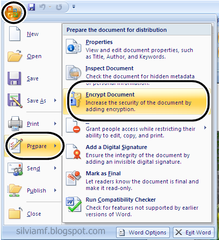 Setelah kita selesai mengerjakan sebuah dokumen langsung saja klik office button yang ada di pojok kiri atas lalu pilih prepare >> encript document